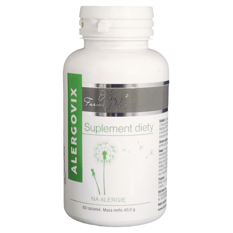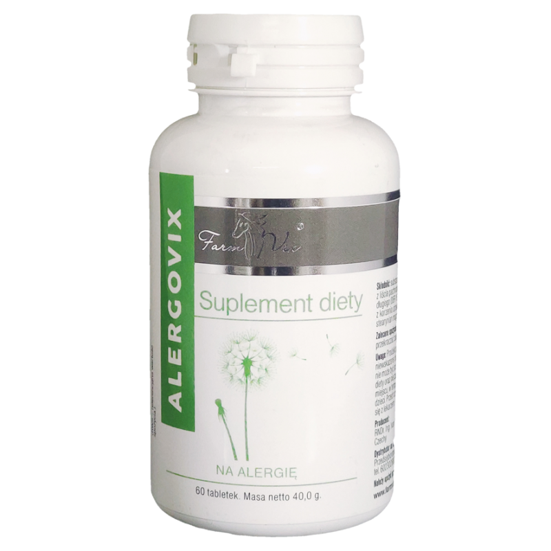 Alergovix od marki FARM-VIX to suplement diety w formie 60 tabletek, które zawierają ekstrakty z roślin takich jak ostryż długi, pachnotka zwyczajna, atraktylod oraz sproszkowane kłącze imbiru lekarskiego. Opakowanie wystarcza na 30 dni regularnego stosowania – 1 tabletka dwa razy dziennie. To propozycja dla osób poszukujących suplementu o czystym składzie bazującym na ekstraktach roślinnych.