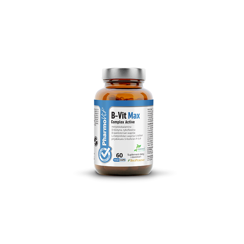 Poznaj B-Vit Max Complex Active od PharmoVit – suplement w formie 60 roślinnych kapsułek Vcaps®, który łączy witaminy z grupy B w wysokich dawkach. W opakowaniu znajdziesz porcję na 30 dni regularnego stosowania (1 kapsułka dwa razy dziennie). To propozycja dla osób, które szukają preparatu z przejrzystym składem i formami witamin o dobrze rozpoznawalnej jakości.