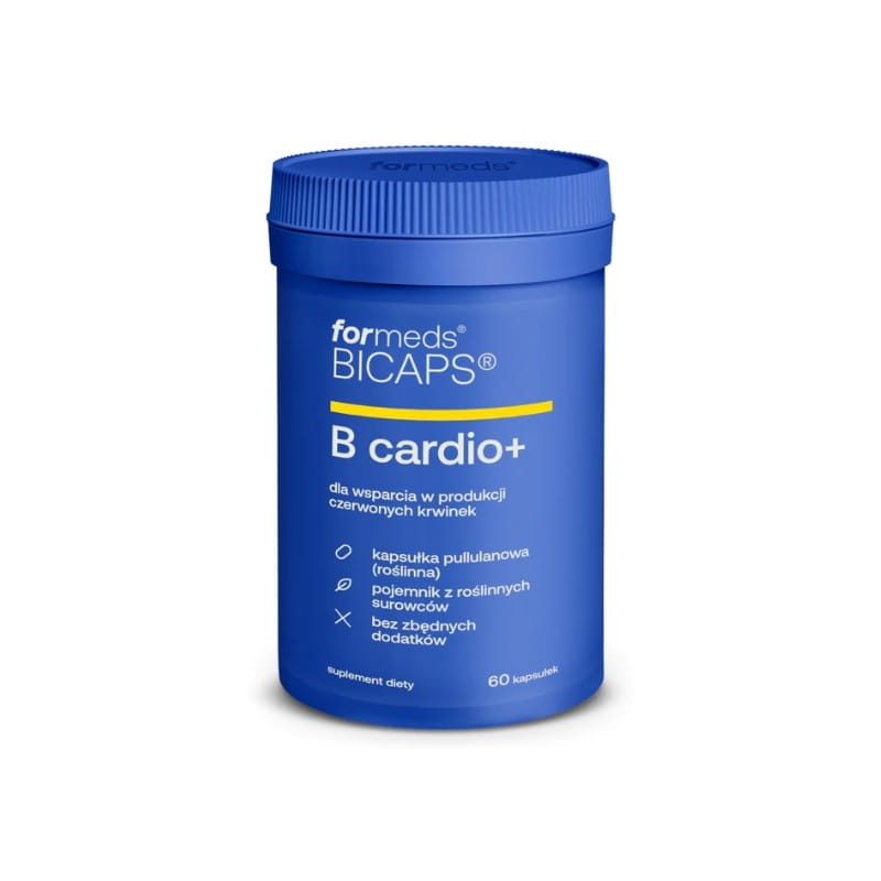 B cardio+ to suplement w formie 60 kapsułek, który łączy trzy witaminy z grupy B w formach: metylokobalaminę (B12), P-5-P (aktywną formę witaminy B6) oraz L-metylofolian wapnia (folian, B9). W składzie znajdziesz także inulinę z korzenia cykorii. Produkt dystrybuowany przez FORMEDS Sp. z o.o.