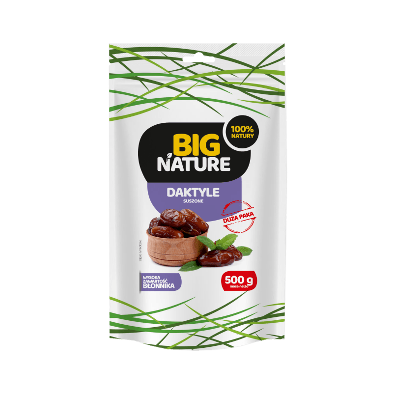 Poznaj daktyle suszone od marki BIG Nature w wygodnym opakowaniu 500 g. To produkt, który możesz sięgnąć zarówno jako samodzielną przekąskę, jak i dodatek do ulubionych dań. W składzie znajdziesz wyłącznie 100% daktyli suszonych, bez zbędnych dodatków.