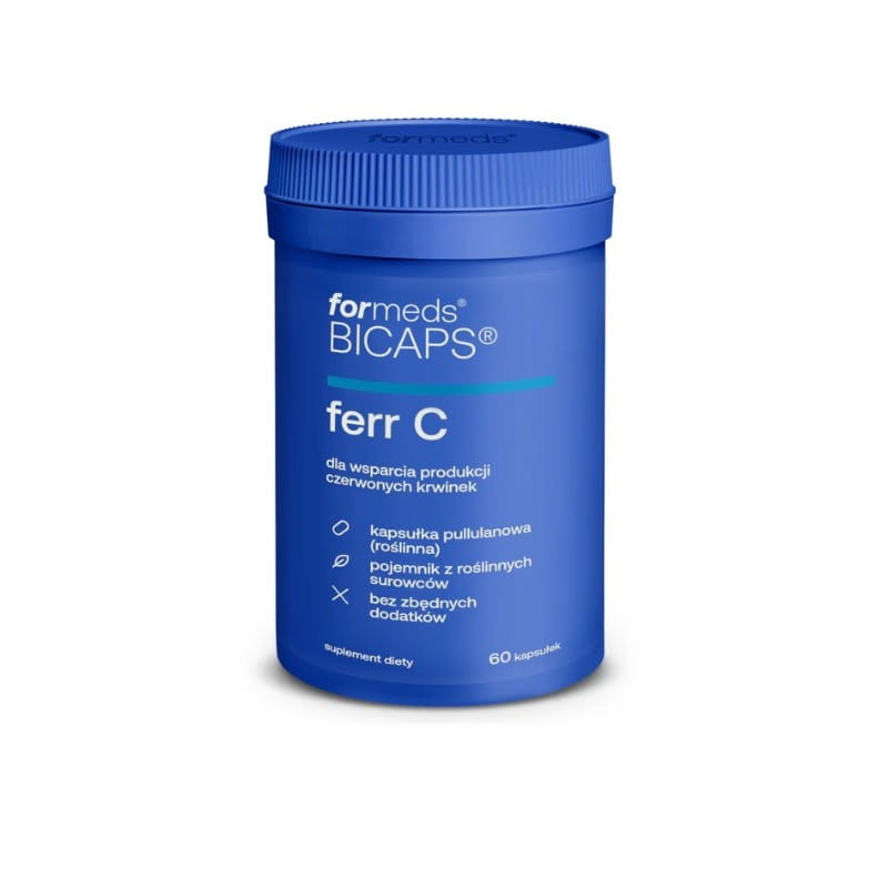 Ferr C to suplement w formie kapsułek, w opakowaniu zawierającym 60 sztuk, co wystarcza na około 2 miesiące regularnego stosowania. W składzie znajdziesz połączenie fumaran żelaza oraz witaminy C w formie kwasu L-askorbinowego, uzupełnione o inulinę z korzenia cykorii. Produkt dystrybuowany jest przez FORMEDS Sp. z o.o.
