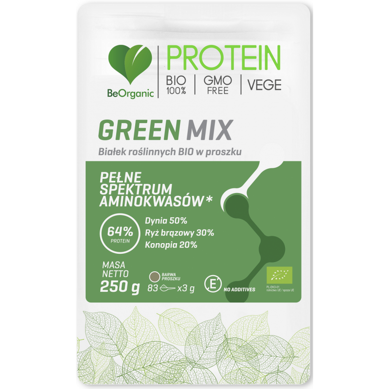 Green MIX białek roślinnych BIO w proszku 250g BeOrganic Dynia Ryż brązowy Konopia Kwas L-glutaminowy L-arginina