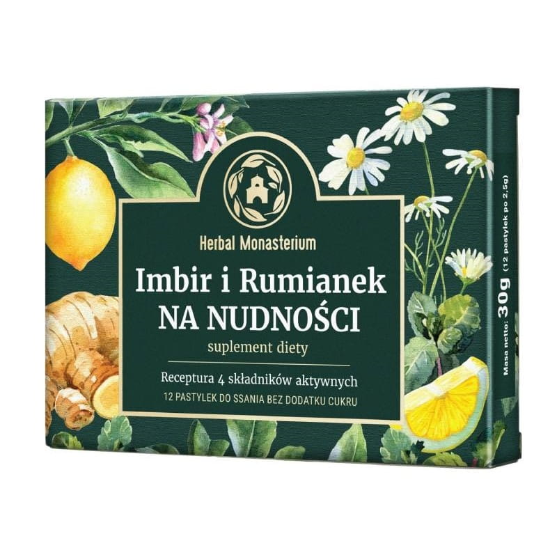 Imbir i Rumianek NA NUDNOŚCI 12 pastylek do ssania Herbal Monasterium rumianek imbir mięta