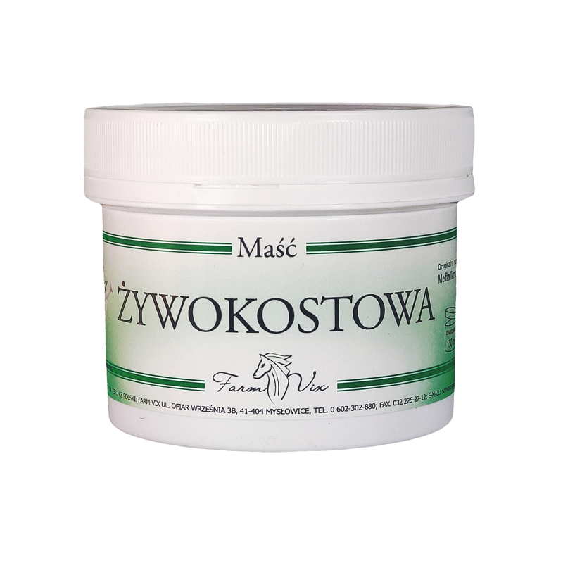Przyjazna skórze maść żywokostowa, przynosi ulgę w stanach napięcia mięśniowego. Można ją stosować do masażu terapeutycznego oraz po wysiłku fizycznym. Posiada działanie relaksujące. Maść jest także stosowana do pielęgnacji skóry podrażnionej czynnikami zewnętrznymi. 150 ml.