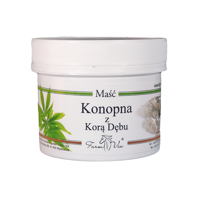 Maść konopna z korą dębu zawiera olejek z nasion konopi, który bogaty jest w nienasycone kwasy tłuszczowe oraz ekstrakt z kory dęby, który posiada działanie ściągające.