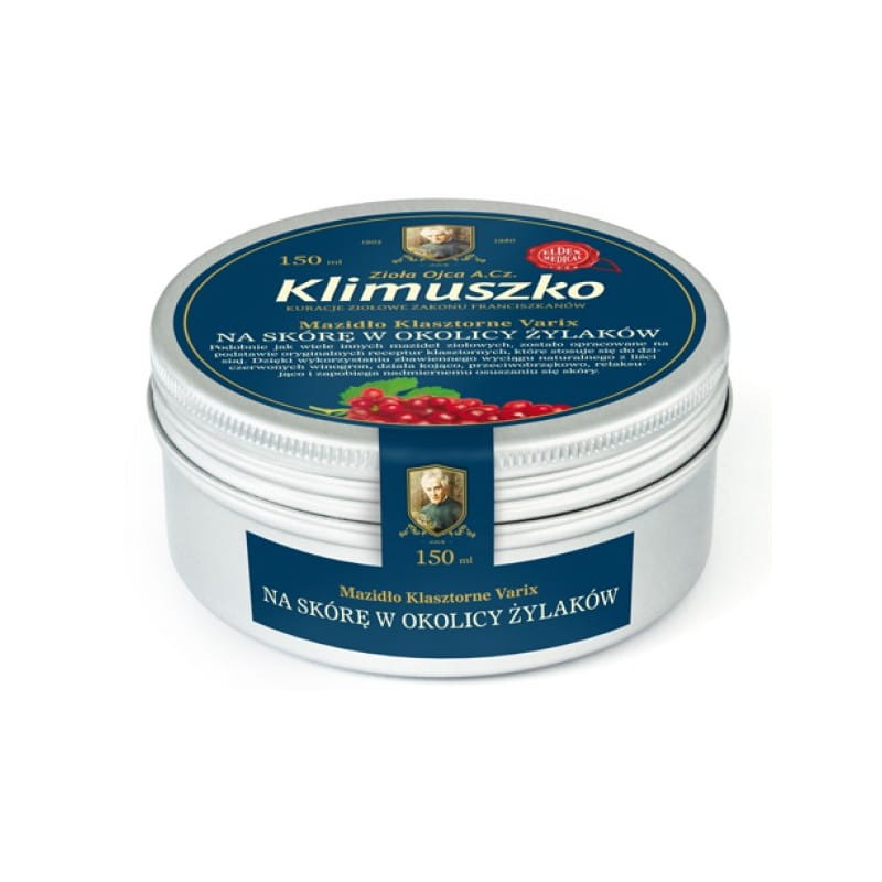 Mazidło na skórę w okolicy żylaków VARIX,ziołowe mazidło przynosi ulgę umęczonym nogom. Ta klasztorna receptura z wykorzystaniem zbawiennego wyciągu naturalnego z winogron, działa kojąco i relaksująco.Opakowanie : 150 ml