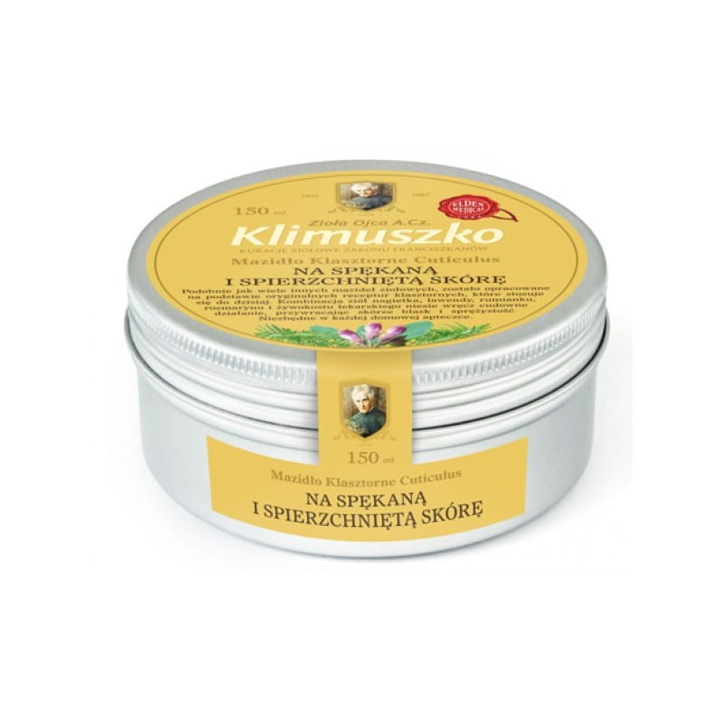 Mazidło na spękaną i spierzchniętą skórę CUTICULUS,ziołowe mazidło na spękaną, suchą i spierzchniętą skórę całego ciała, a zwłaszcza dłoni, łokci, stóp i kolan. Ta kombinacja pięciu ziół: nagietka, lawendy, rumianku, rozmarynu i żywokostu lekarskiego niesie wręcz cudowne działanie, przywracając skórze blask i sprężystość.Opakowanie : 150 ml