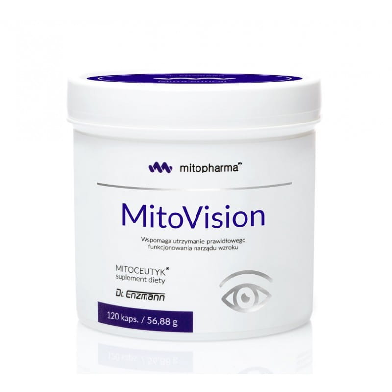 MitoVision to suplement w formie 120 kapsułek, który łączy składniki takie jak tauryna, koenzym Q10, kwas alfa-liponowy, cynk, niacyna oraz luteina z zeaksantyną. Produkt pochodzi od producenta MSE Pharmazeutika GmbH Dr. Franz H. Enzmann z Niemiec, a dystrybutorem jest Mito-Pharma. Jedna kapsułka dziennie to wygodna forma podania, a opakowanie wystarcza na około 4 miesiące stosowania.