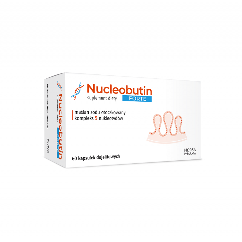 Nucleobutin Forte to suplement w formie kapsułek, w opakowaniu zawierającym 60 sztuk. W składzie znajduje się połączenie maślanu sodu, w tym kwasu masłowego, oraz kompleks pięciu nukleotydów: urydyny, cytydyny, inozyny, guanozyny i adenozyny. Produkt dystrybuowany jest przez Norsa Pharma (Thyroset).