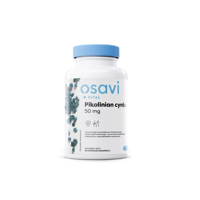 Poznaj suplement diety Osavi w formie 120 kapsułek twardych zawierających pikolinian cynku – organiczną formę cynku. Każda kapsułka dostarcza 50 mg pikolinianu cynku, w tym 10 mg cynku, co odpowiada 100% referencyjnej wartości spożycia (RWS). Opakowanie wystarcza na 4 miesiące codziennego stosowania – wygodna forma podania to jedna kapsułka z posiłkiem dziennie.