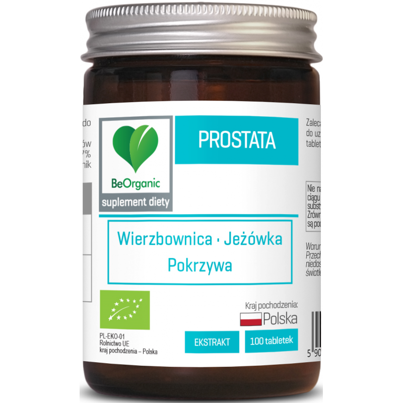 Prostata 100 tabl. od marki BeOrganic to suplement w formie tabletek, który łączy ekstrakty z wierzbownicy drobnokwiatowej, jeżówki purpurowej oraz pokrzywy zwyczajnej. Opakowanie zawiera 100 tabletek, co przy dawkowaniu 1 tabletki dwa razy dziennie wystarcza na około 50 dni stosowania. To propozycja dla osób poszukujących suplementu o czystym, ekologicznym składzie.