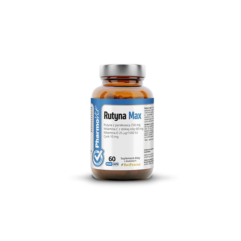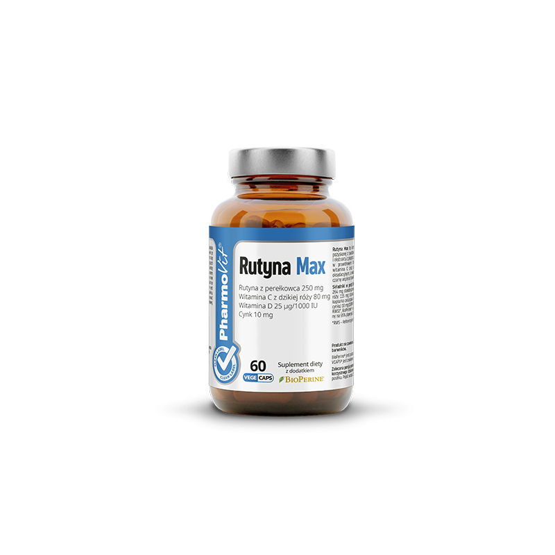Rutyna Max od PharmoVit to suplement w formie 60 kapsułek roślinnych, które wystarczą na 2 miesiące regularnego stosowania – jedna kapsułka dziennie. W składzie znajdziesz kompleks rutyny z perełkowca japońskiego, witaminę C pozyskaną z owoców dzikiej róży, cynk w formie cytrynianu, witaminę D oraz ekstrakt z pieprzu czarnego BioPerine®. To propozycja dla osób, które szukają produktu z czystym, transparentnym składem i bez zbędnych wypełniaczy.