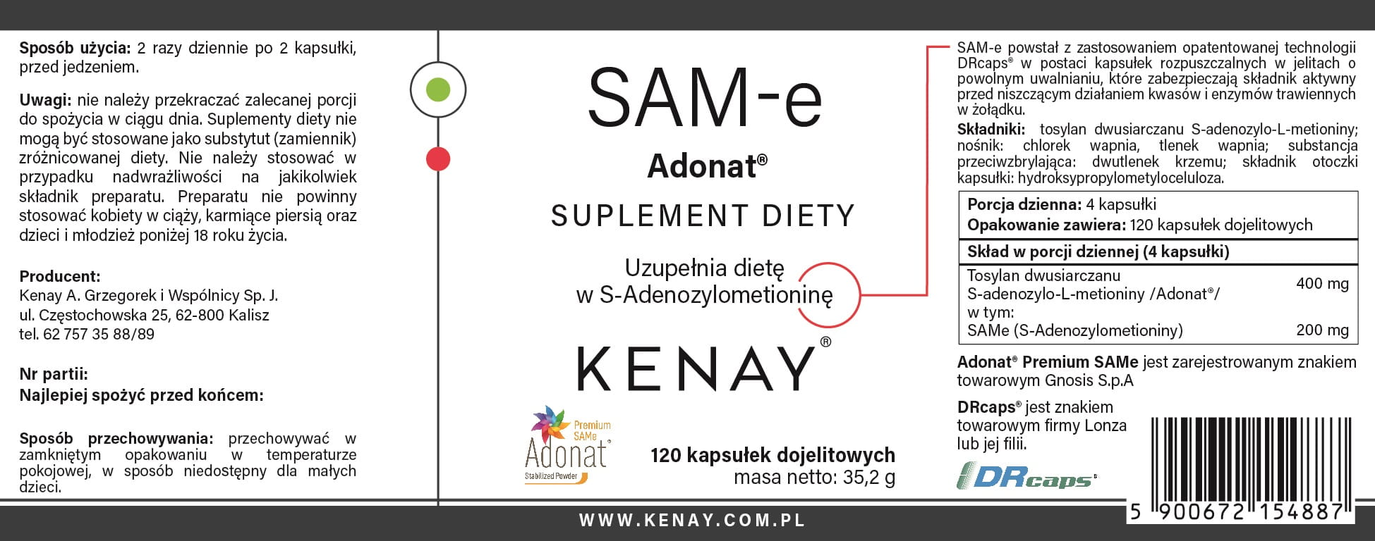 SAM-e S-Adenosyl-L-Methionine ADONAT® (120 kapsułek dojelitowych) - suplement diety