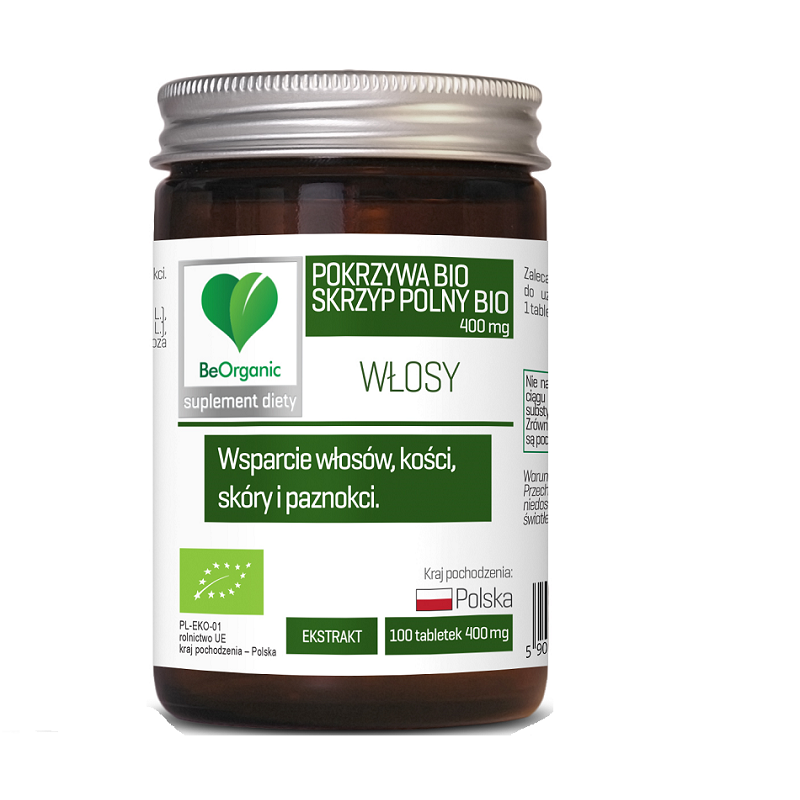 Skrzyp polny + Pokrzywa bio 400mg 100 tabl. BeOrganic – tabletki z ekstraktami roślinnymi w czystym składzie