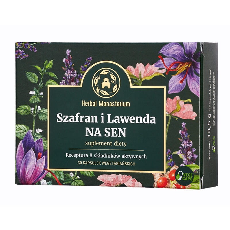 Szafran i Lawenda na Sen 30 kaps. Herbal Monasterium ashwagandha lawenda kozłek lekarski melisa głóg błonnik akacjowy melatonina