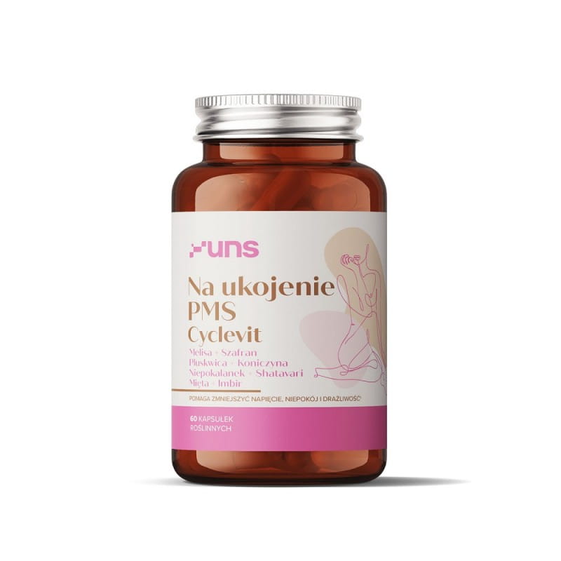 UNS Cyclevit – kompleks wspierający komfort cyklu i PMS: melisa, szafran, pluskwica groniasta, koniczyna, niepokalanek, shatavari, mięta, imbir – 60 kapsułek