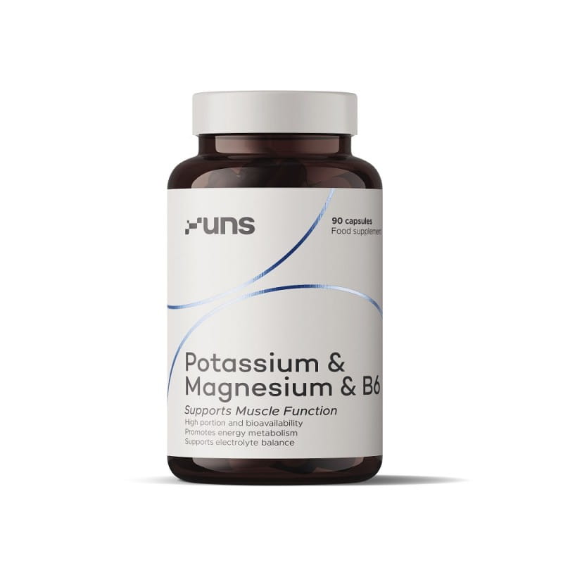 UNS Potassium & Magnesium & B6 – kompleks mineralno‑witaminowy: potas (cytrynian potasu), magnez (cytrynian magnezu), witamina B6 (chlorowodorek pirydoksyny) – 90 kapsułek