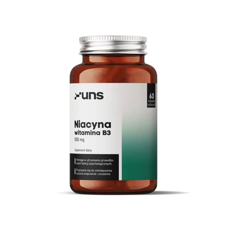 UNS Witamina B3 (Niacyna) 500 mg to suplement diety w formie kapsułek, opracowany jako jednoskładnikowa formuła witaminowa, przeznaczona do świadomej suplementacji osób dbających o prawidłowy metabolizm energetyczny, funkcjonowanie układu nerwowego oraz ogólną równowagę organizmu. Produkt zawiera witaminę B3 w formie kwasu nikotynowego, jednej z podstawowych postaci niacyny.