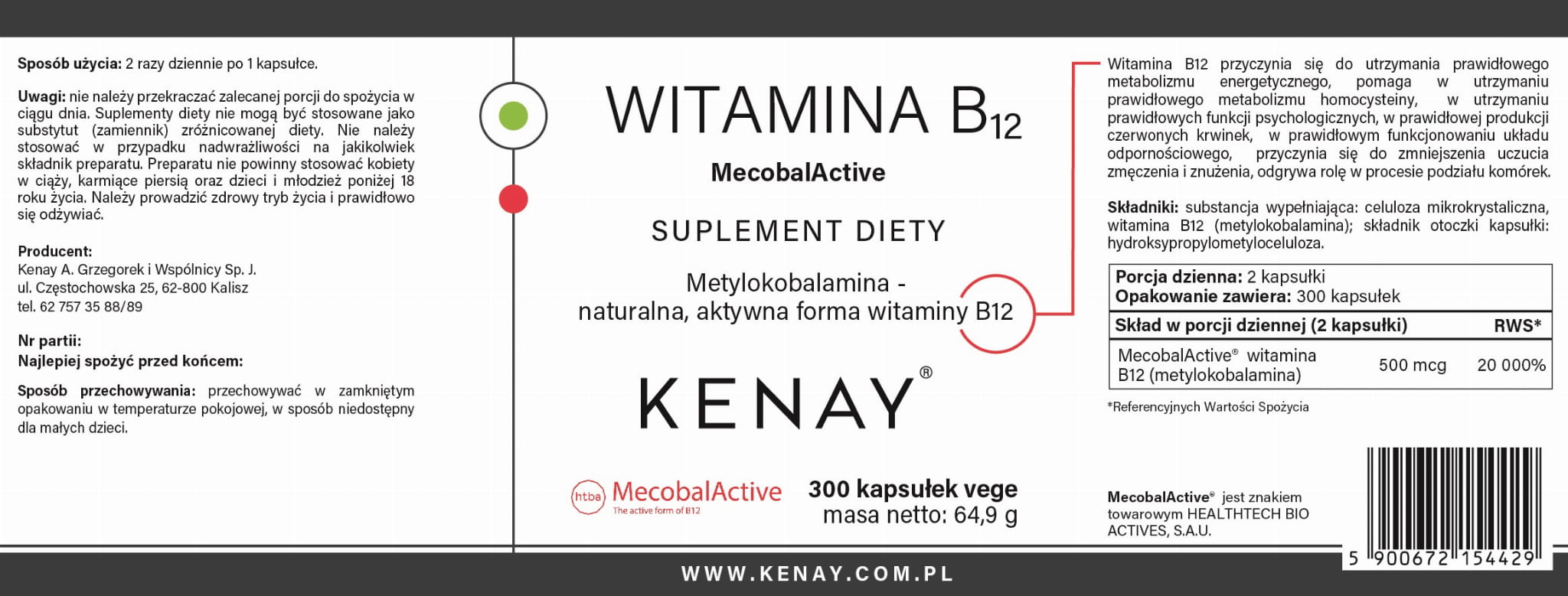 Składniki: substancja wypełniająca: celuloza mikrokrystaliczna, witamina B12 (metylokobalamina), kapsułka: hydroksypropylometyloceluloza.