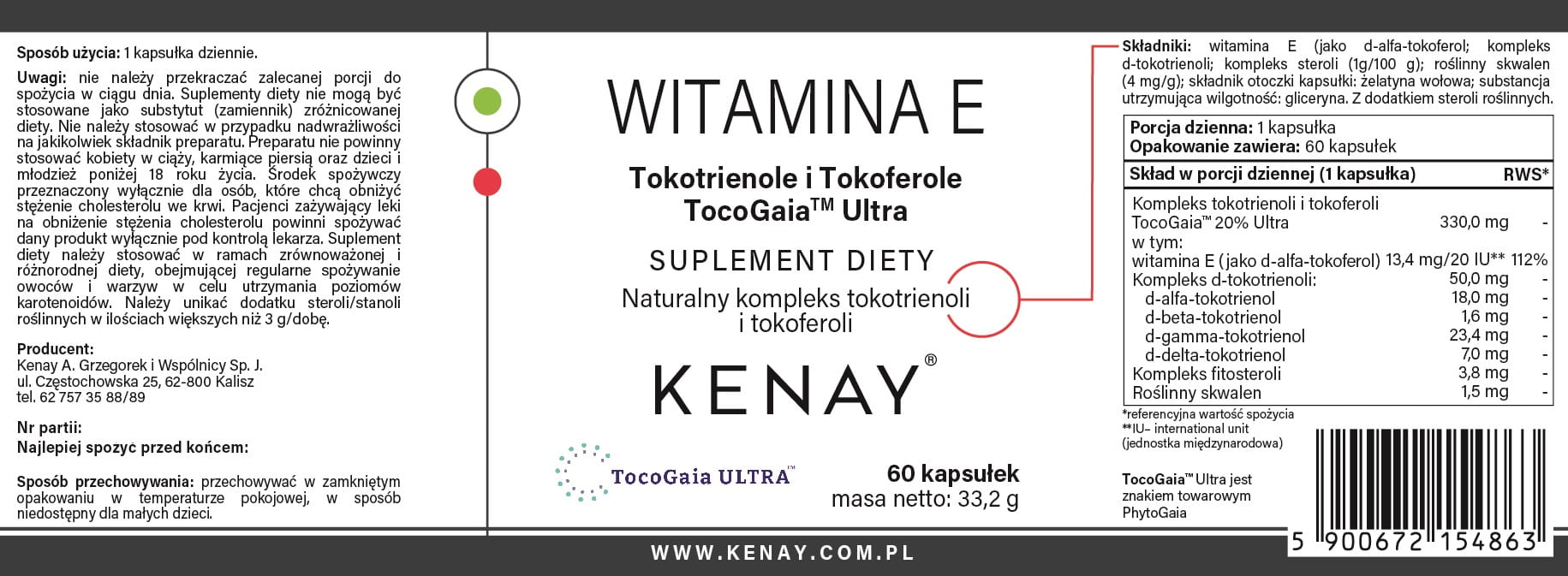 Składniki: witamina E (jako d-alfa-tokoferol; kompleks d-tokotrienoli; kompleks steroli (1g/100 g); roślinny skwalen (4 mg/g); kapsułka: żelatyna wołowa; substancja utrzymująca wilgotność: gliceryna.