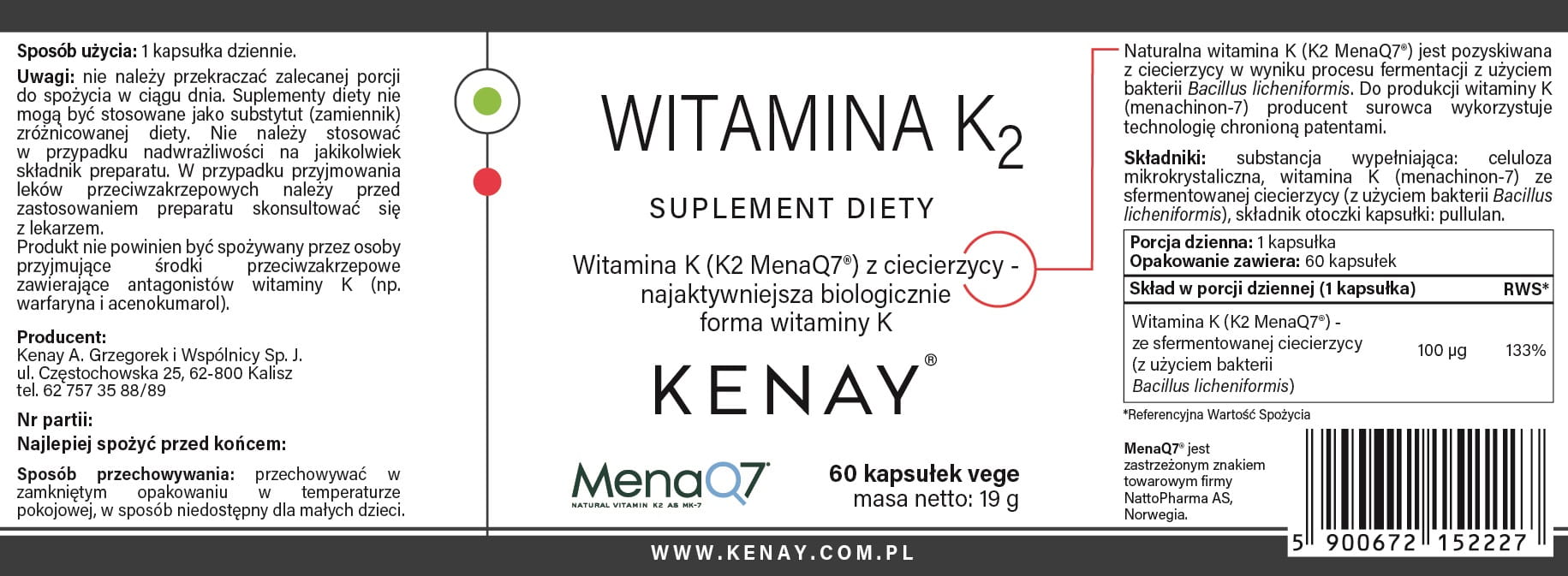 Składniki: substancja wypełniająca: celuloza mikrokrystaliczna, witamina K (menachinon-7) ze sfermentowanej ciecierzycy (z użyciem bakterii Bacillus licheniformis), składnik otoczki kapsułki: pullulan.