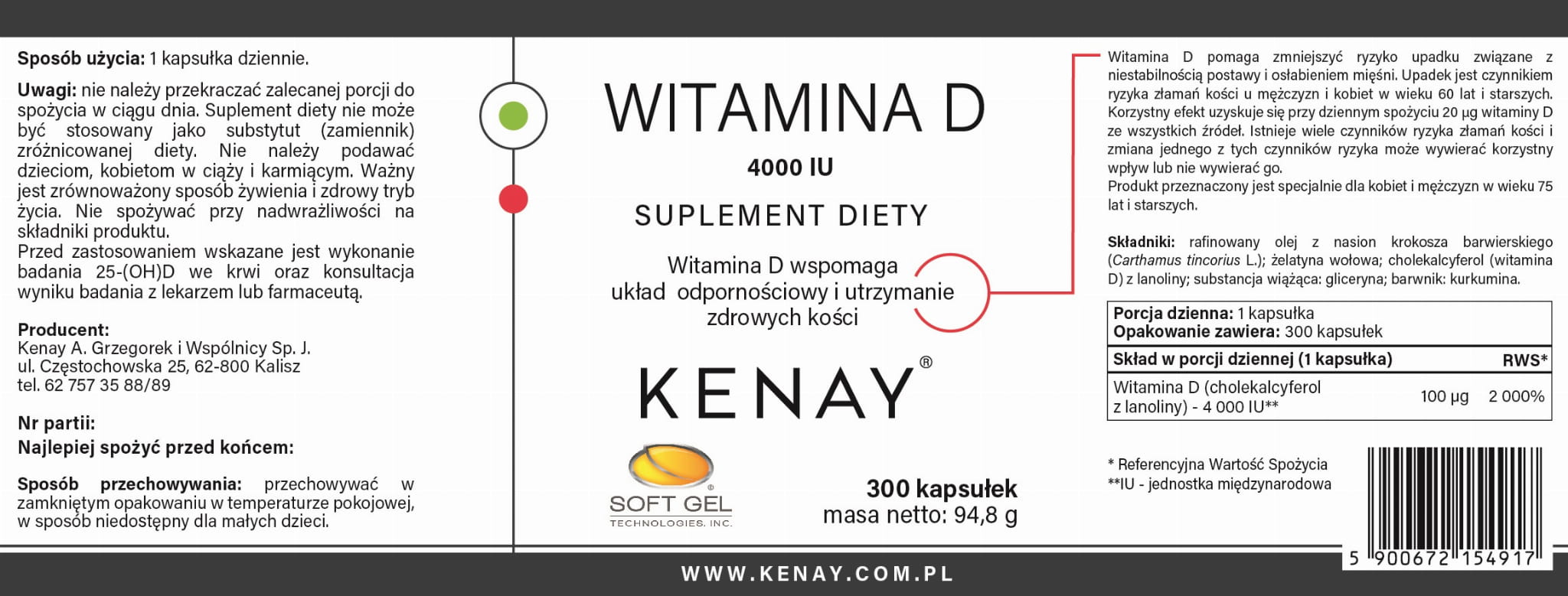 Składniki: rafinowany olej z nasion krokosza barwierskiego (Carthamus tincorius L.); żelatyna wołowa; cholekalcyferol (witamina D3) z lanoliny; substancja wiążąca: gliceryna; barwnik: kurkumina.