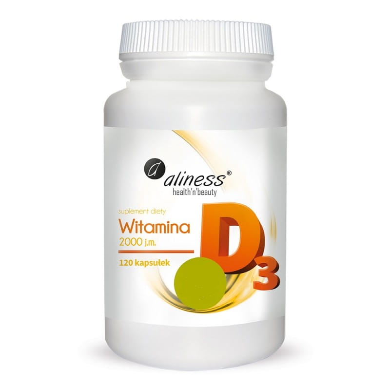 Witamina D3 2000 Aliness. Witamina D wspiera prawidłową odporność organizmu, wpływa korzystnie na wchłanianie wapnia i fosforu, przyczynia się do prawidłowego poziomu wapnia we krwi, oraz do prawidłowej budowy zębów. Wspiera funkcjonowanie mięśni, przyczynia się do prawidłowej budowy kości. Opakowanie 120 kaps.