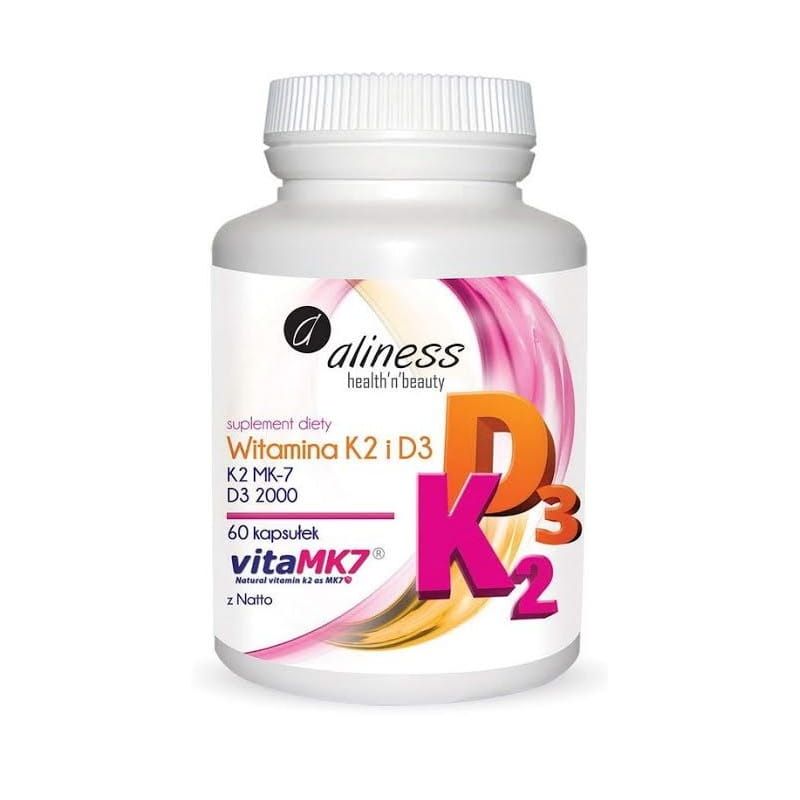 Witamina K2 - MK7 + D3 2000 Aliness. Wspiera odporność organizmu, wpływa korzystnie na wchłanianie wapnia i fosforu, przyczynia się do prawidłowego poziomu wapnia we krwi, oraz do prawidłowej budowy zębów. Wspiera prawidłową budowę kości i pracę mięśni. Opakowanie 60 kaps.