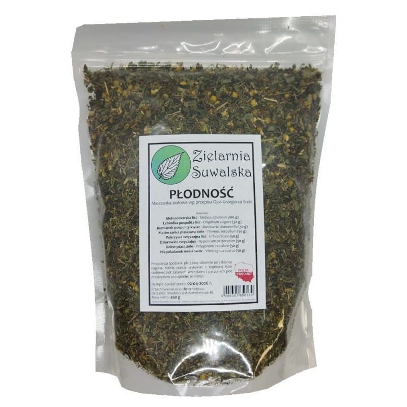 Zioła „Płodność” to starannie skomponowana mieszanka ziół stworzona z myślą o osobach, które pragną wspierać swoje zdrowie rozrodcze — zarówno kobiety, jak i mężczyzn. Receptura opracowana przez Ojca Grzegorza Srokę w ramach Zielarni Suwalskiej łączy w sobie rośliny tradycyjnie stosowane w fitoterapii dla równowagi hormonalnej, wsparcia układu rozrodczego, pracy wątroby i nerek oraz ogólnej kondycji organizmu. Mieszanka może być stosowana jako element wspierający styl życia ukierunkowany na płodność, przy jednoczesnym prowadzeniu zdrowiej diety i kontroli lekarskiej.